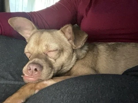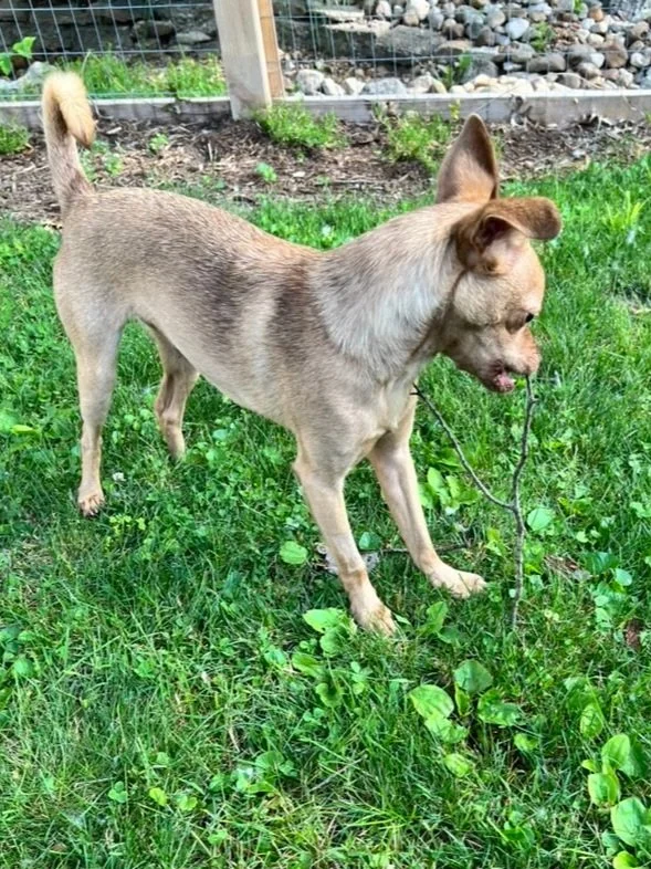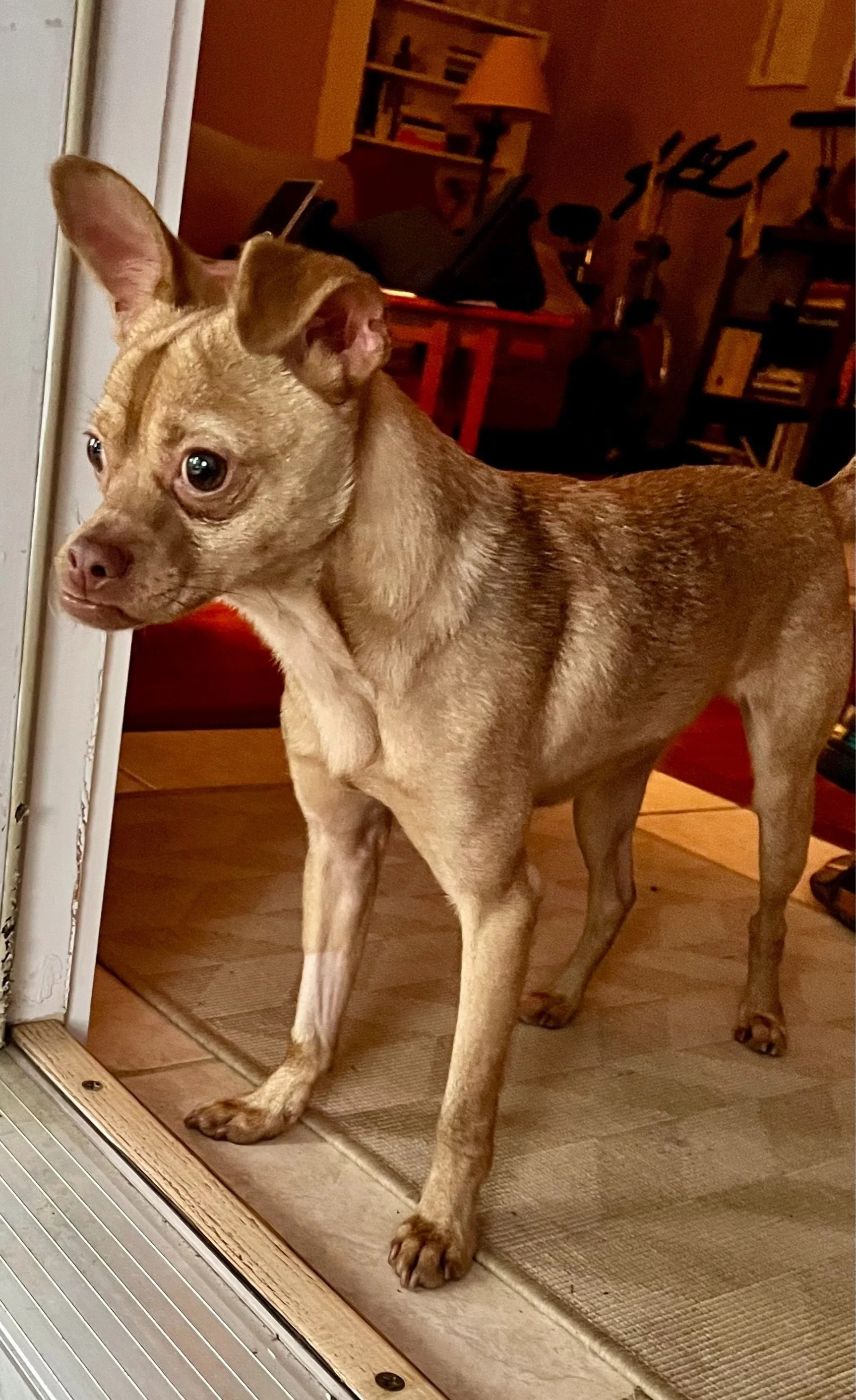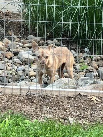 5/22/24 – The Wednesday before Memorial Day weekend, Jon was out feeding the neighborhood cats before he left for school and saw this little guy huddled up outside our fence. Jon called me out and asked if I could help the little guy. It took 40 minutes of offering some cat food and cheese to get the pup to come onto the front porch with me, then another 2 hours before he would let me touch him.